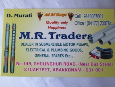 Contact Person : D.Murali Description : M.R Tarders were Dealer In Submersible Motor Pumps,Electrical & Plumbing Goods,Spares