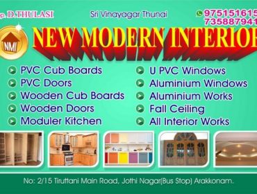 Contact Person : D.Thulasi, D.Kirankumar Description : New Modern Interior provides PVC Cub Borads,UPVC Windows,Woodern Cub Boards, Interior works, Electrican,Plumber
